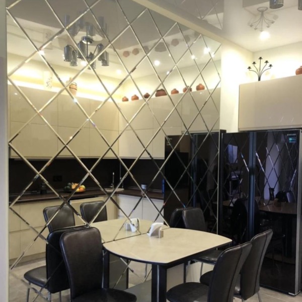 Лучшим решением для увеличения пространство в маленькой кухне - зеркальная плитка с фацетом
